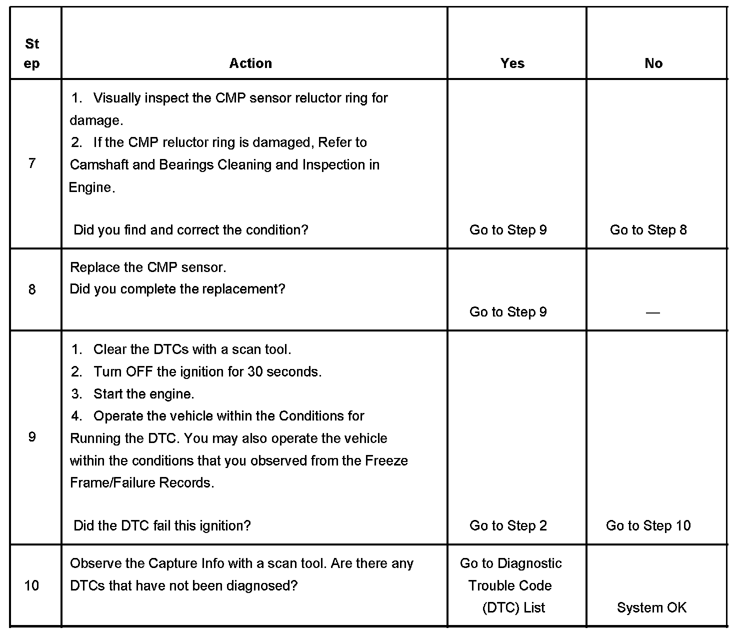 6. Damage to the face of the sensor could indicate foreign material passing between the CMP sensor and the reluctor wheel. This condition would cause this DTC to set. Damage to the reluctor wheel would affect the CMP sensor output.