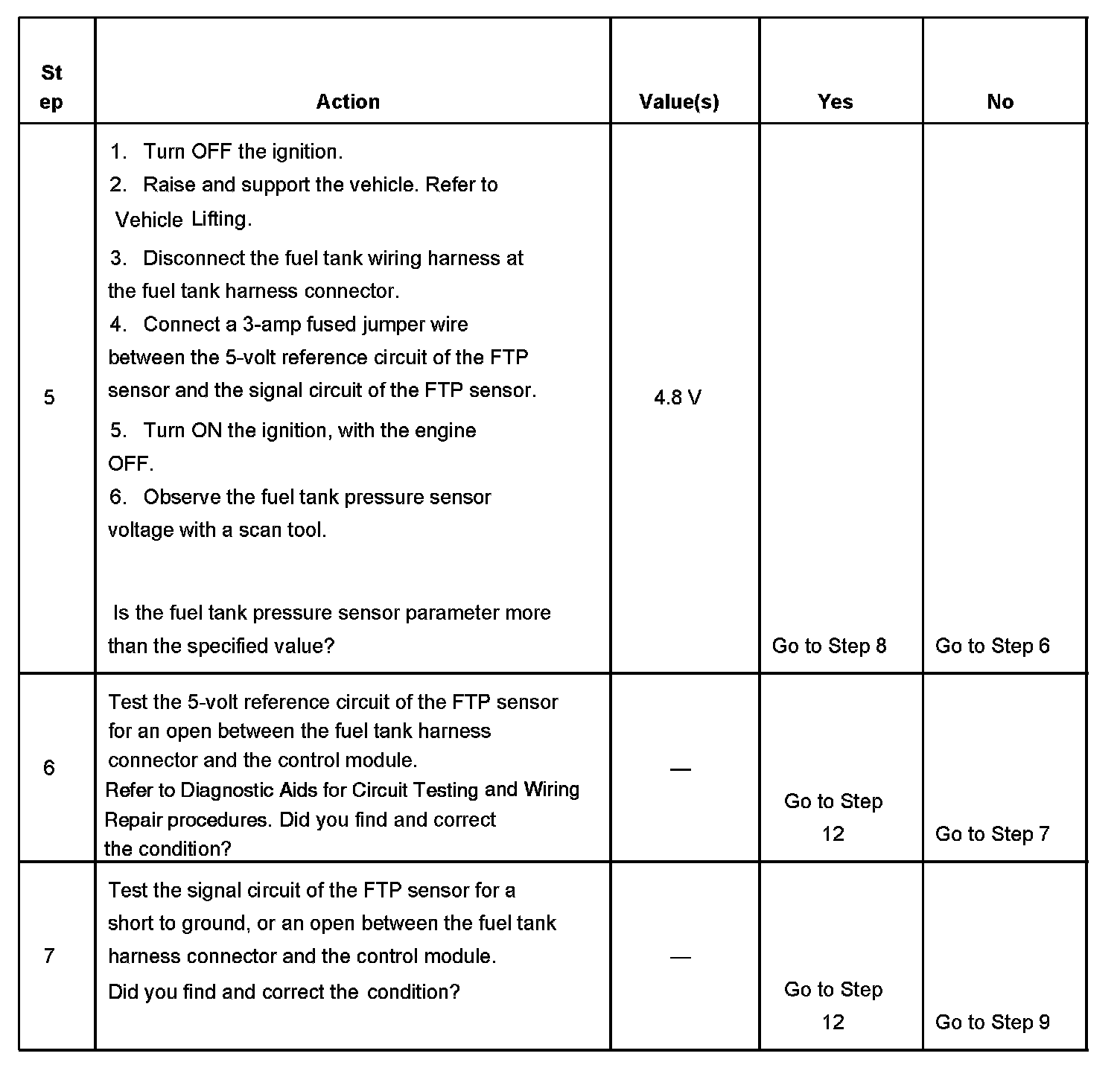 CIRCUIT DESCRIPTIONThe fuel tank pressure (FTP) sensor measures the difference between the air pressure or vacuum in the evaporative emission (EVAP) system, and the outside air pressure. The control module supplies a 5-volt reference and a low reference circuit to the FTP sensor. The FTP sensor signal circuit voltage varies depending on EVAP system pressure or vacuum. If the FTP sensor signal voltage goes below a calibrated value, this DTC sets.