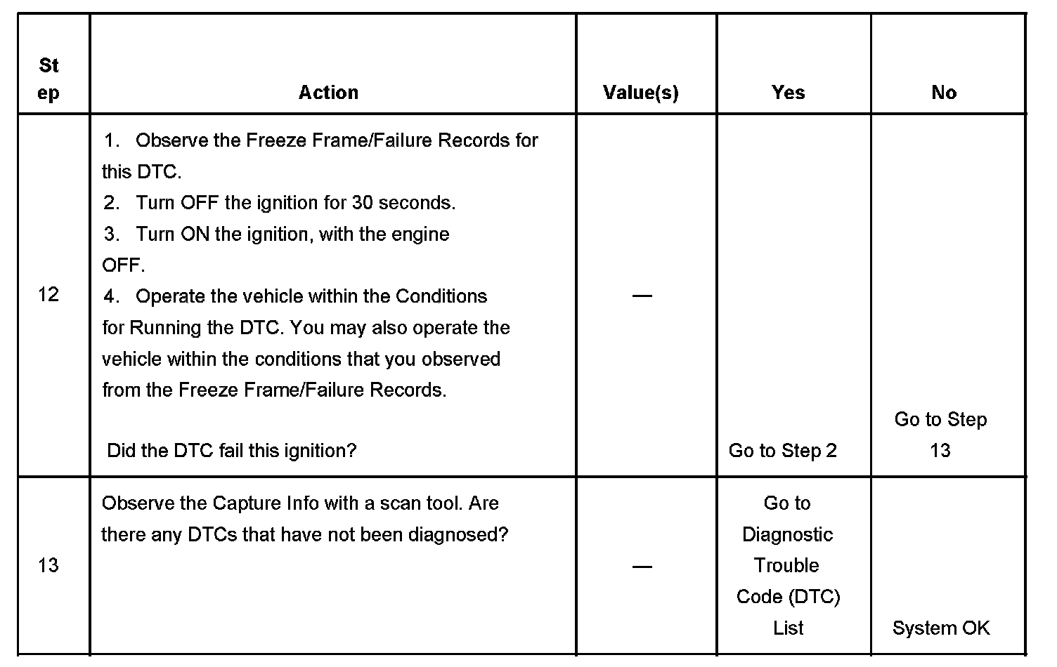 - The control module records the operating conditions at the time the diagnostic fails. The first time the diagnostic fails, the control module stores this information in the Failure Records. If the diagnostic reports a failure on the second consecutive ignition cycle, the control module records the operating conditions at the time of the failure. The control module writes the operating conditions to the Freeze Frame and updates the Failure Records.