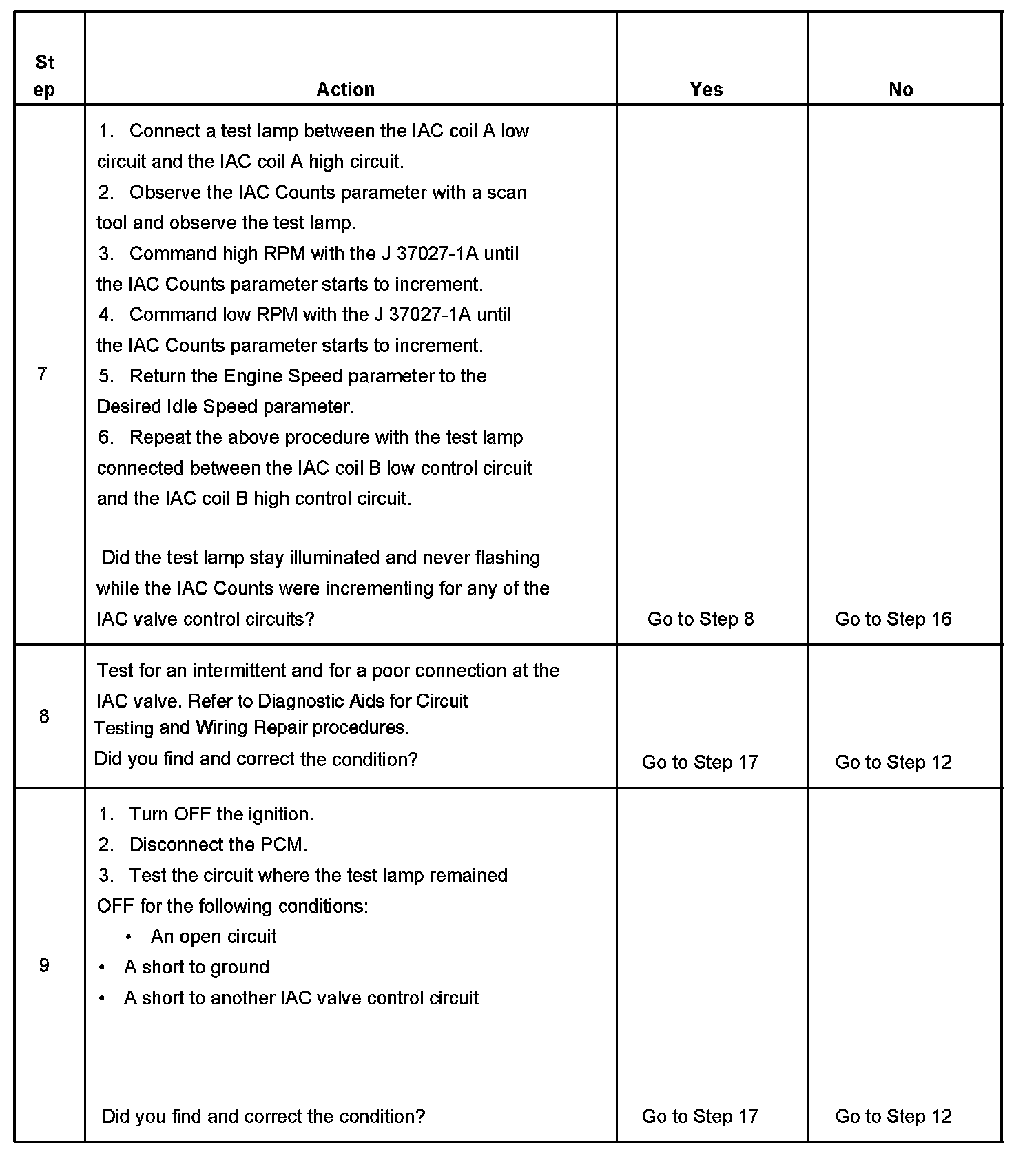 7. This test will determine the ability of the PCM to provide the IAC valve control circuits with a ground. On a normal operating system, the test lamp should not flash while the IAC Counts are incrementing.