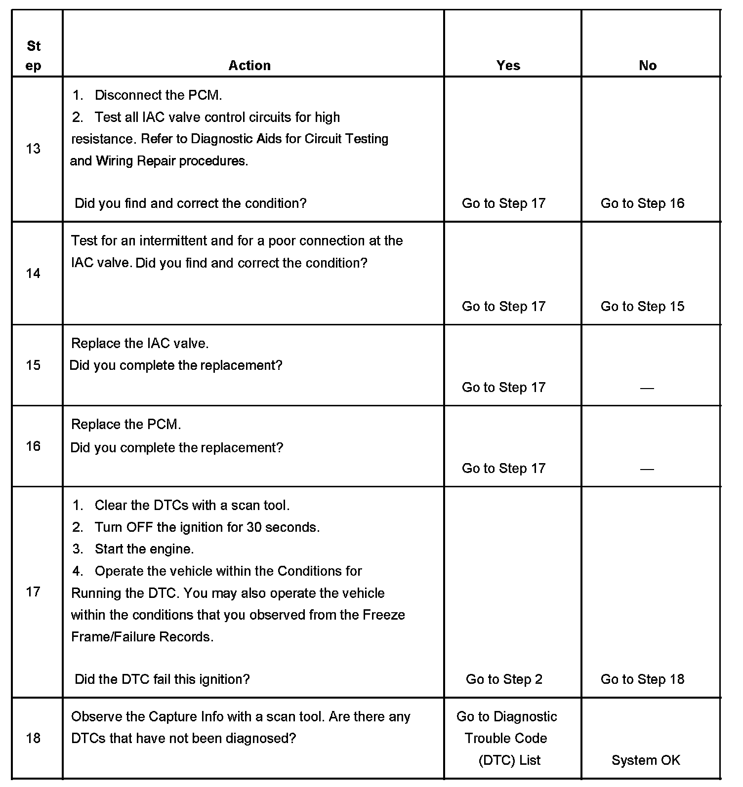 CIRCUIT DESCRIPTIONThe engine idle speed is controlled by the idle air control (IAC) valve. The IAC valve is on the throttle body. The IAC valve pintle moves in and out of an idle air passage bore to control air flow around the throttle plate. The IAC valve consists of a movable pintle, driven by a gear attached to an electric motor called a stepper motor. The stepper motor is capable of highly accurate rotation, or of movement, called steps. The stepper motor has 2 separate windings that are called coils. Each coil is supplied current by two circuits from the powertrain control module (PCM). When the PCM changes polarity of a coil, the stepper motor moves one step. The PCM uses a predetermined number of counts to determine the IAC pintle position. Observe IAC counts with a scan tool. The IAC counts will increment up or down as the PCM attempts to change the IAC valve pintle position. An IAC Reset will occur when the ignition key is turned OFF. First, the PCM will seat the IAC pintle in the idle air passage bore. Second, the PCM will retract the pintle a predetermined number of counts to allow for efficient engine start-up. If the engine idle speed is out of range for a calibrated period of time, an idle speed diagnostic trouble code (DTC) sets.