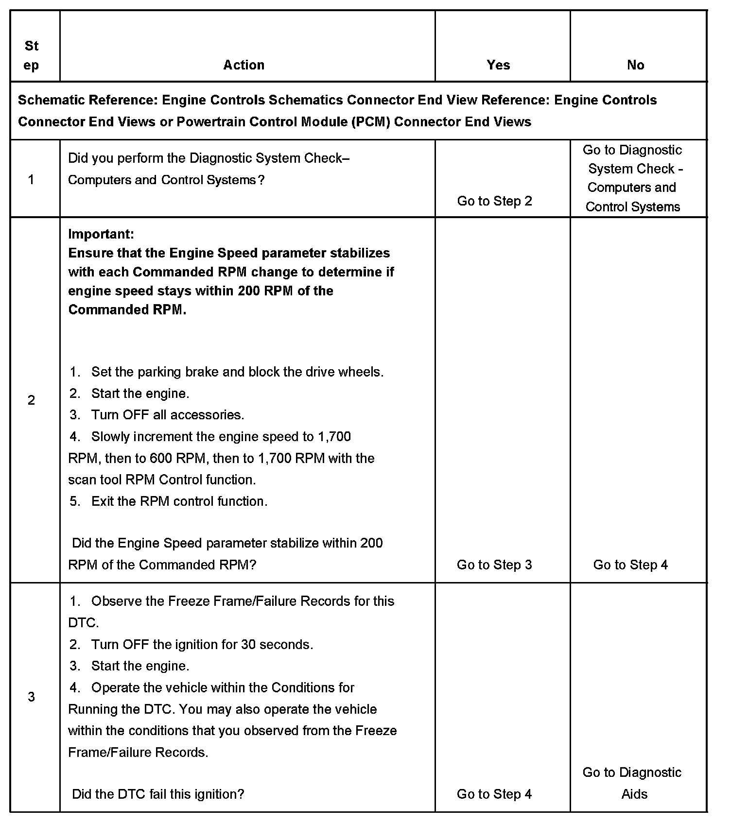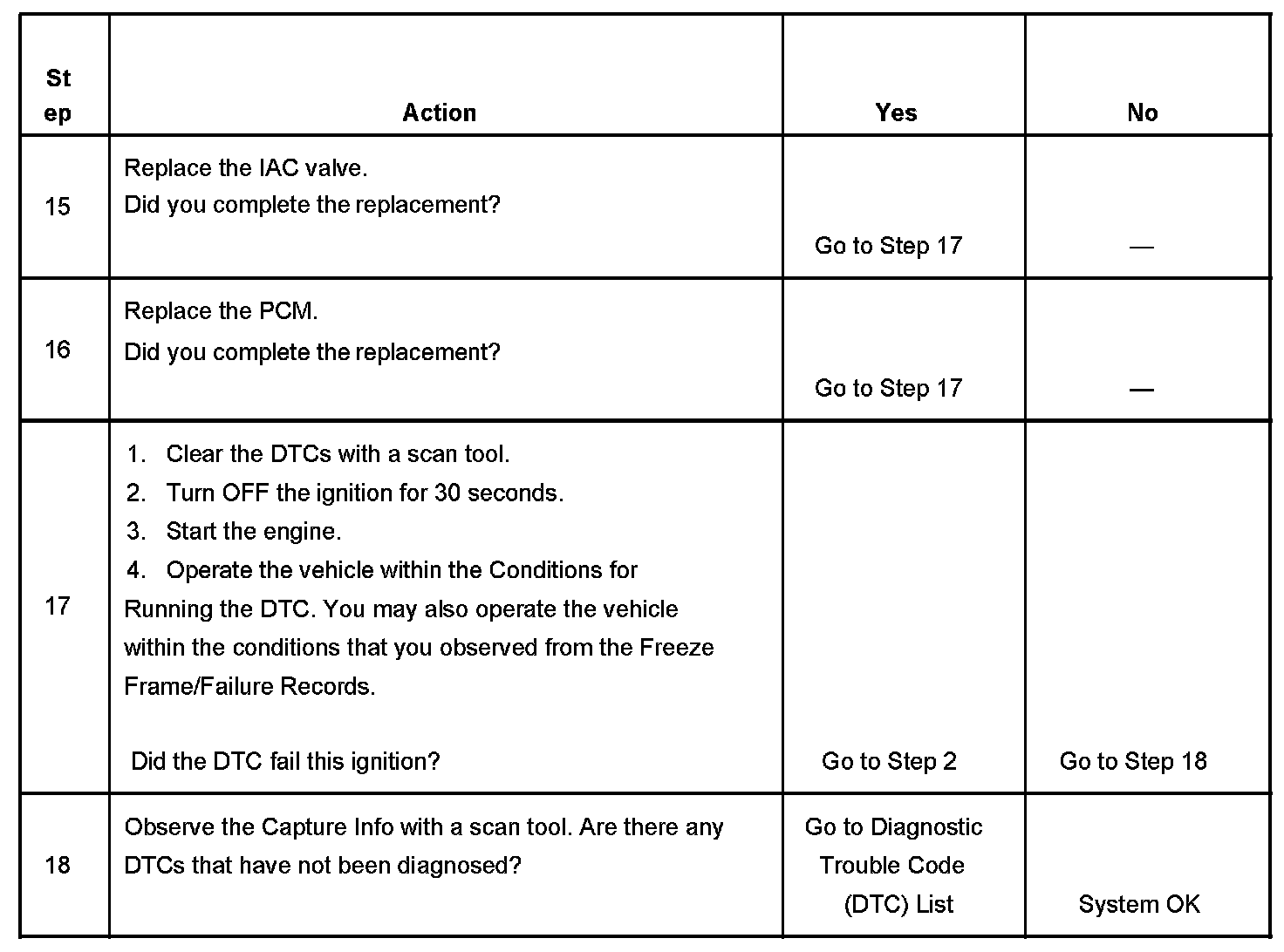 CIRCUIT DESCRIPTIONThe engine idle speed is controlled by the idle air control (IAC) valve. The IAC valve is on the throttle body. The IAC valve pintle moves in and out of an idle air passage bore to control air flow around the throttle plate. The IAC valve consists of a movable pintle, driven by a gear attached to an electric motor called a stepper motor. The stepper motor is capable of highly accurate rotation, or of movement, called steps. The stepper motor has 2 separate windings that are called coils. Each coil is supplied current by two circuits from the powertrain control module (PCM). When the PCM changes polarity of a coil, the stepper motor moves one step. The PCM uses a predetermined number of counts to determine the IAC pintle position. Observe IAC counts with a scan tool. The IAC counts will increment up or down as the PCM attempts to change the IAC valve pintle position. An IAC Reset will occur when the ignition key is turned OFF. First, the PCM will seat the IAC pintle in the idle air passage bore. Second, the PCM will retract the pintle a predetermined number of counts to allow for efficient engine start-up. If the engine idle speed is out of range for a calibrated period of time, an idle speed diagnostic trouble code (DTC) sets.