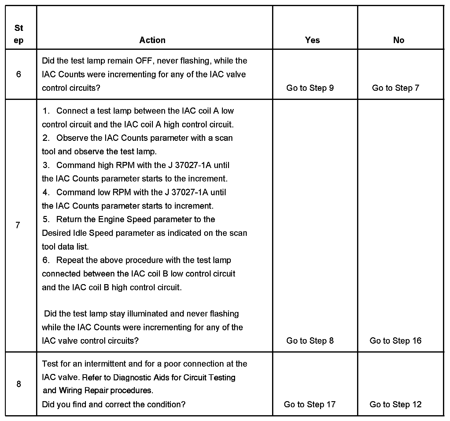 7. This test will determine the ability of the PCM to provide the IAC valve control circuits with a ground. On a normally operating system, the test lamp should not flash while the IAC Counts are incrementing.