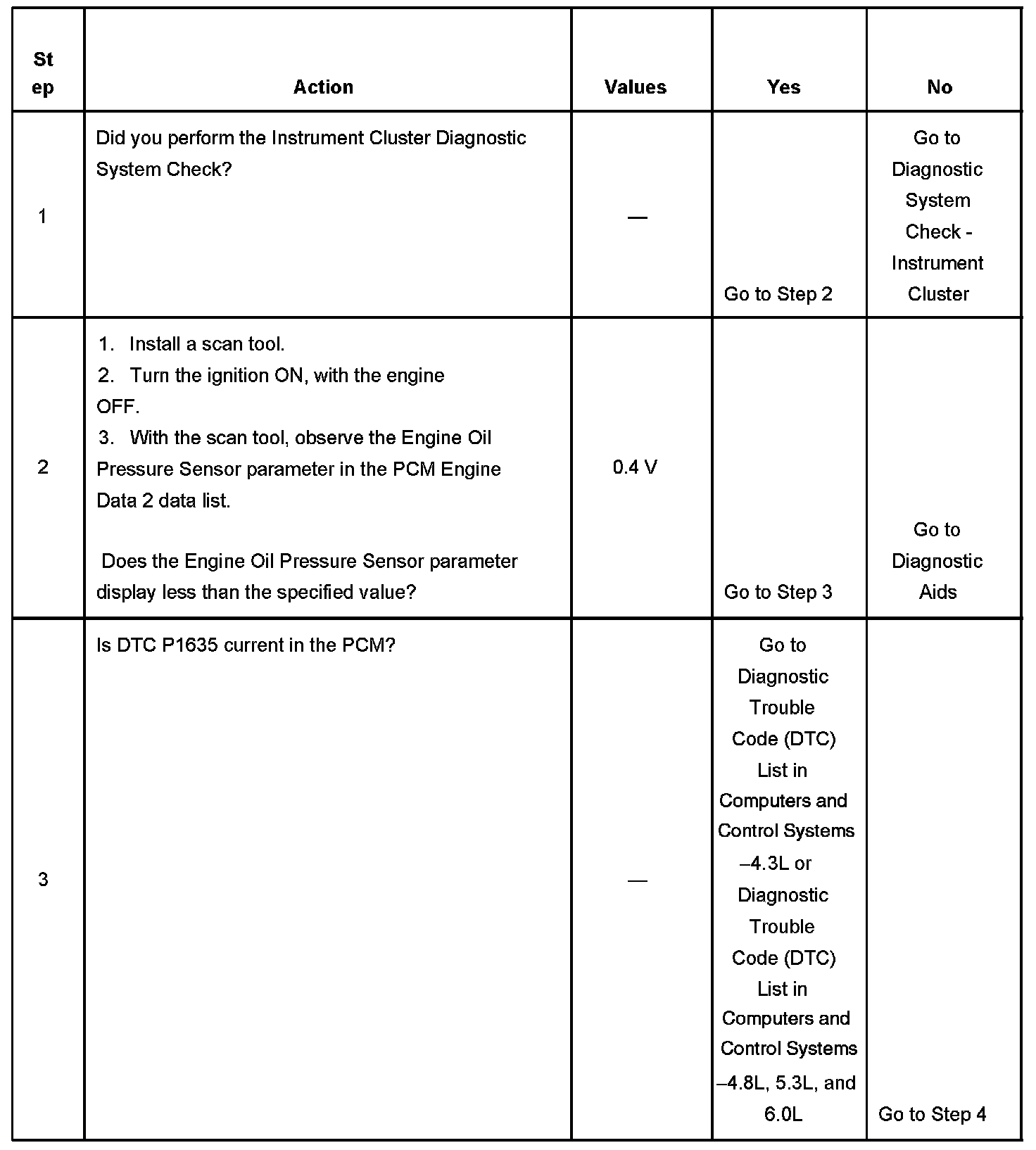 The engine oil pressure (EOP) sensor changes resistance based on engine oil pressure. The PCM monitors the signal circuit of the EOP sensor. When the engine oil pressure is high, the sensor resistance is high, and the PCM senses a high signal voltage. When the engine oil pressure is low, the sensor resistance is low, and the PCM senses a low signal voltage. The PCM sends the engine oil pressure information to the IPC via the class 2 serial data circuit.