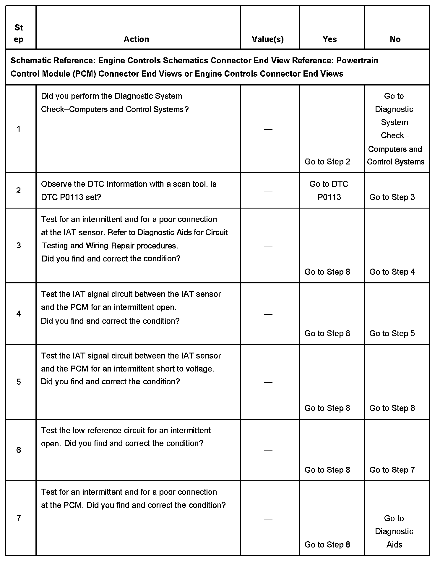 CIRCUIT DESCRIPTIONThe intake air temperature (IAT) sensor is a variable resistor. The IAT sensor has a signal circuit and a low reference circuit. The IAT sensor measures the temperature of the air entering the engine. The powertrain control module (PCM) supplies 5 volts to the IAT signal circuit and a ground for the IAT low reference circuit. When the IAT sensor is cold, the sensor resistance is high. When the air temperature increases, the sensor resistance decreases. With high sensor resistance, the PCM detects a high voltage on the IAT signal circuit. With lower sensor resistance, the PCM detects a lower voltage on the IAT signal circuit. If the PCM detects an intermittent high IAT signal voltage, indicating a low temperature, DTC P1111 sets.