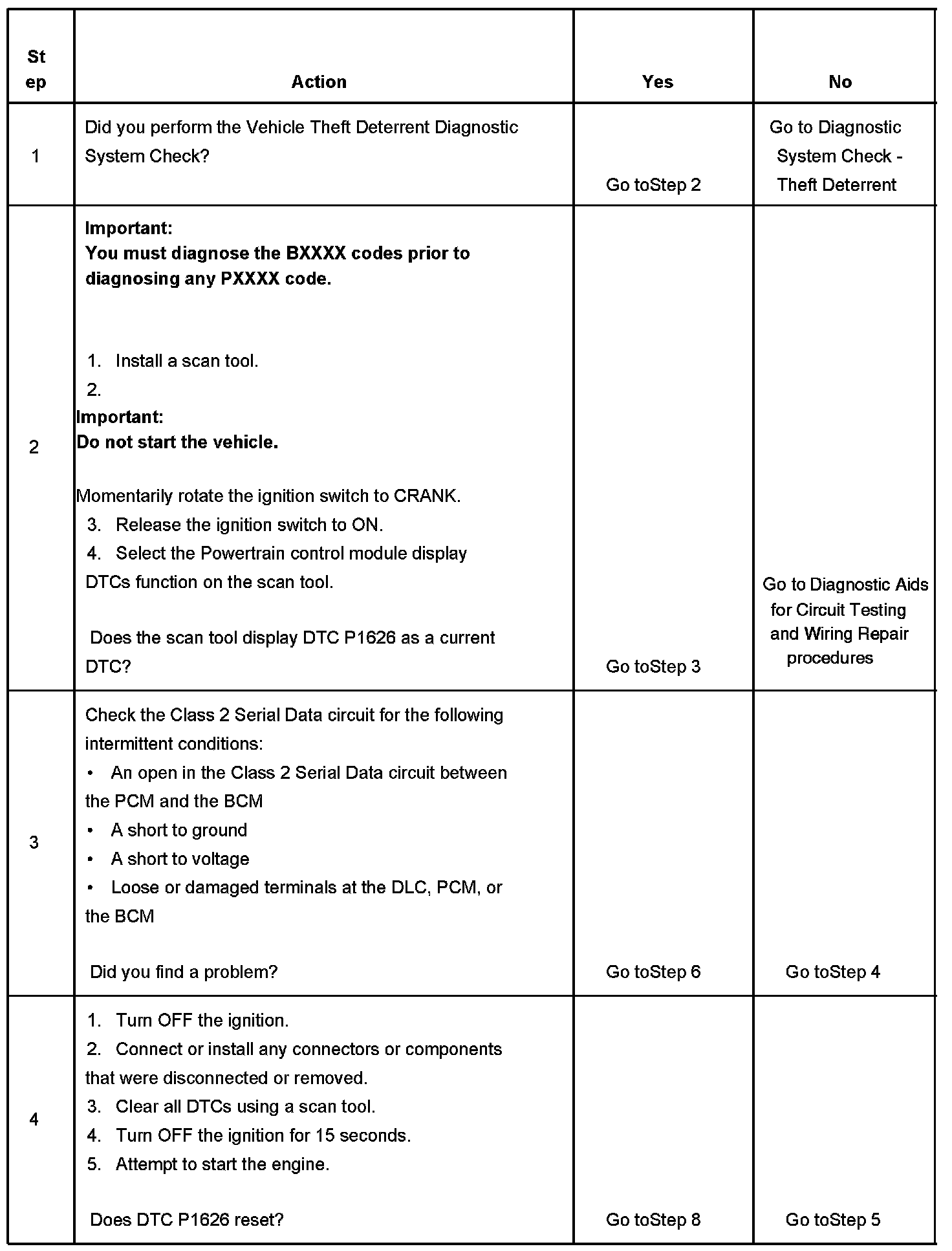 - If the Class 2 Serial Data circuit is shorted to ground or shorted to voltage, then all systems connected to the serial data circuit will not be able to communicate properly. Systems capable of storing loss of communications DTCs, or the DTCs with the letter "U" as a prefix, will have these codes stored in their memory. If a DTC U1192 is stored in the PCM memory along with the P1626, then a fault occurred at some point after the PCM received the correct password. The BCM must also be checked for intermittent operation due to a loss of power or ground to the module itself. After repairing the cause of DTC 1626, clear all DTCs from the systems capable of storing this DTC and DTC U1192.