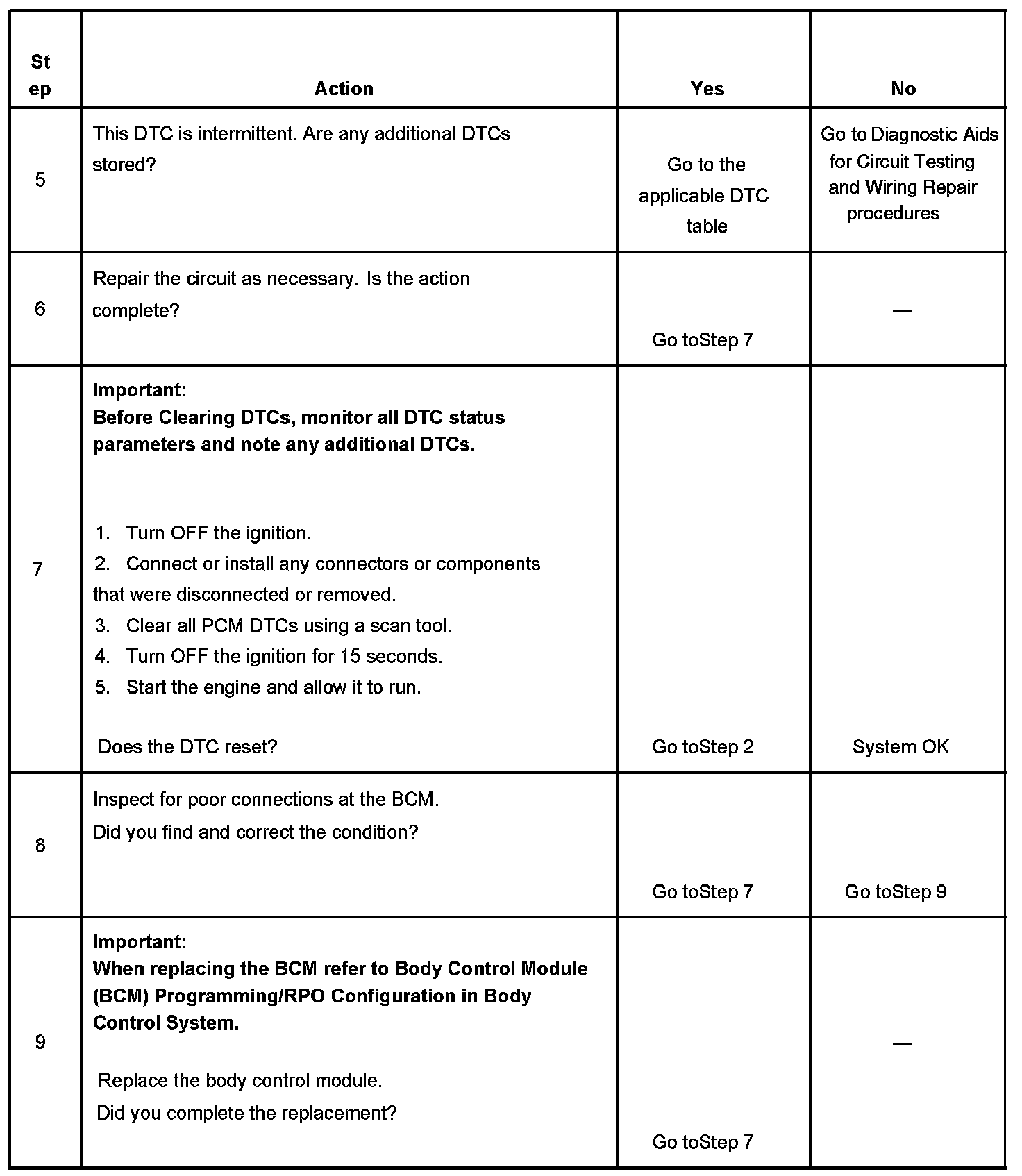 The numbers below refer to the step numbers on the diagnostic table.