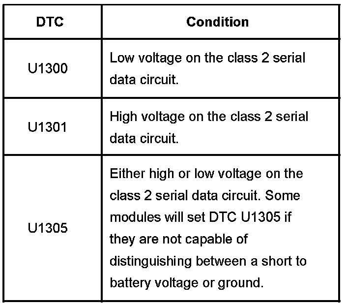 Modules connected to the class 2 serial data circuit monitor for serial data communications during normal vehicle operation. Operating information and commands are exchanged among the modules. In addition to this, Node Alive messages are transmitted by each module on the class 2 serial data circuit about once every 2 seconds. When the module detects one of the following conditions on the class 2 serial data circuit for approximately 3 seconds, the setting of all other class 2 serial communication DTCs is inhibited and a DTC will set.
