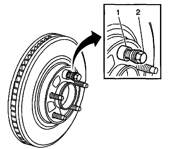4. Hold the rotor firmly in place against the hub/axle flange and install one of the J45101-100 (1), and one lug nut (2) onto the upper-most wheel stud.