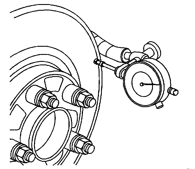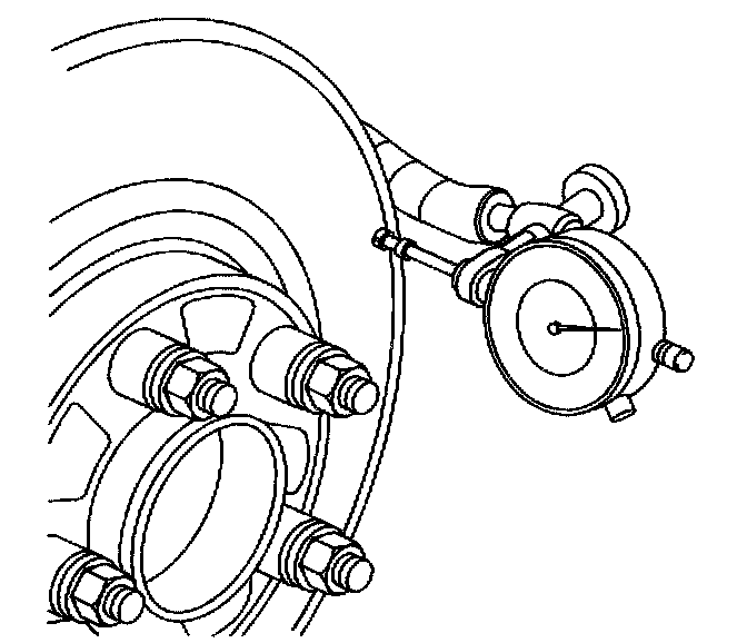 10. Mount a dial indicator, J45101, or equivalent, to the steering knuckle and position the indicator button so it contacts the brake rotor friction surface at a 90 degree angle, approximately 13 mm (0.5 inch) from the outer edge of the rotor.