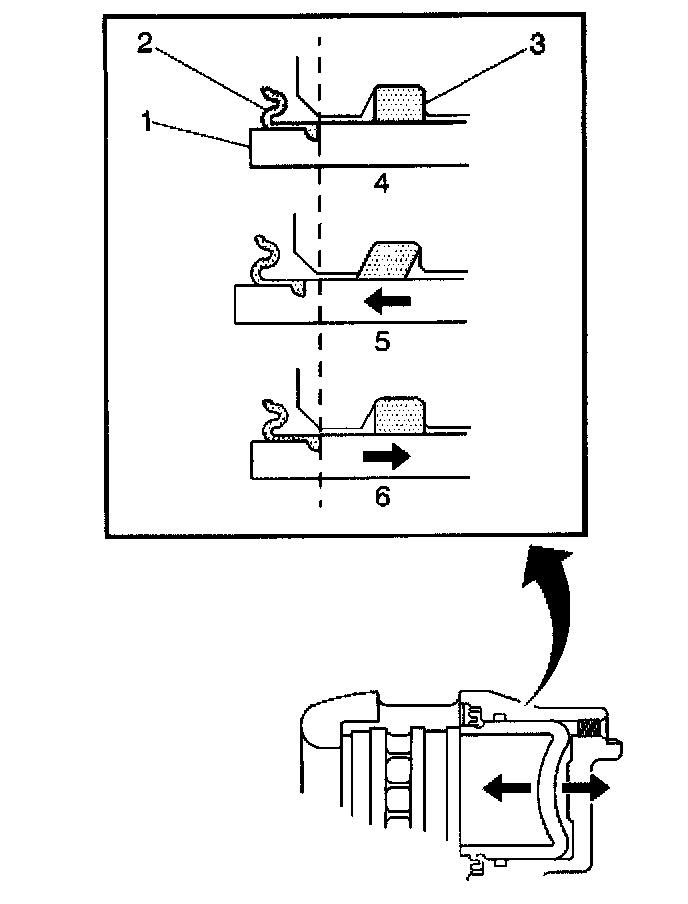 3. While the brake system is at rest (4), observe the position of the caliper piston (1) in relation to the caliper housing.
