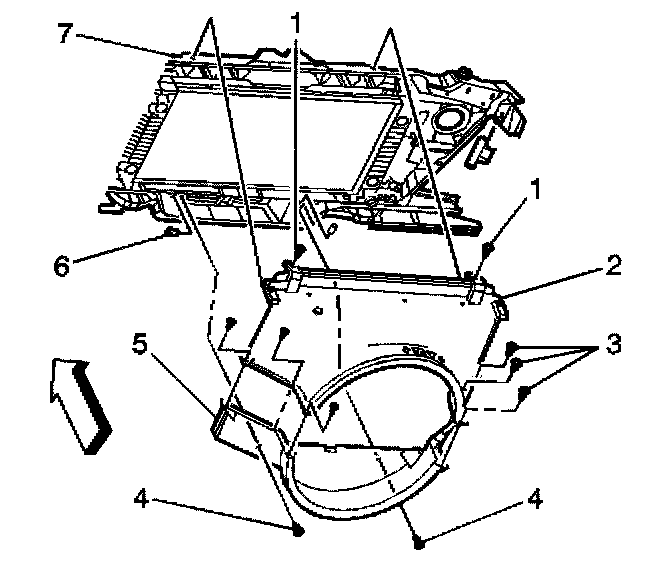 1. Remove the fan shroud bolts (1) from the top of the radiator support.