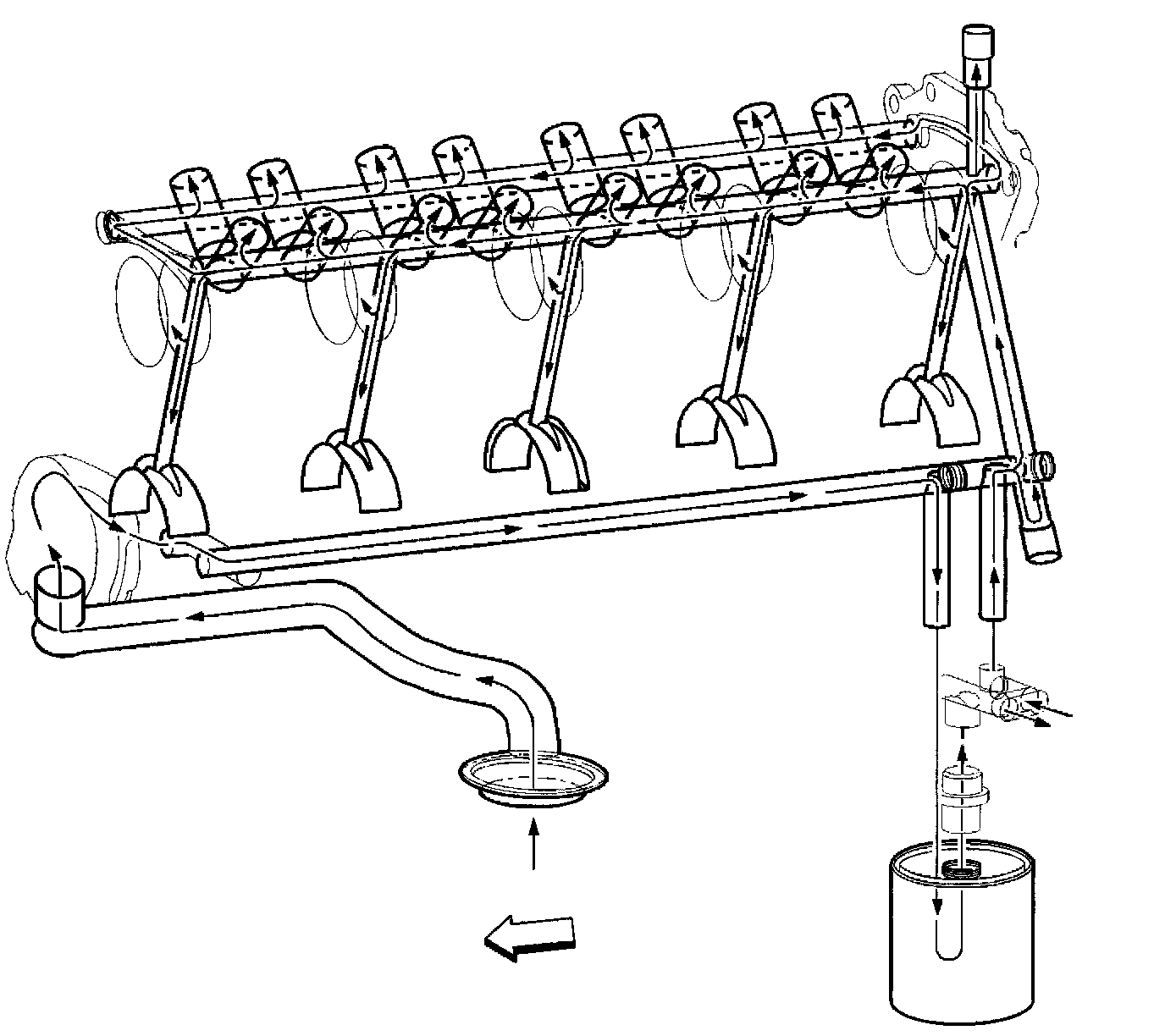 An external oil cooler is available on certain applications, all 6.0L. Oil is directed from the oil pump. through the lower main oil gallery to the full flow of filter. Oil is then directed through the oil pan outlet oil gallery, located in the left rear of the oil pan, and to the external oil cooler via a hose assembly. Oil flows through the oil cooler and returns to the engine at the oil pan inlet oil gallery, located in the left rear of the oil pan. Oil is then directed to the upper main oil galleries and the remainder of the engine assembly.