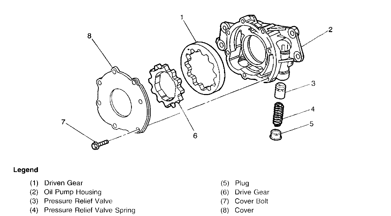 Engine lubrication is supplied by a gerotor type oil pump assembly. The pump is mounted on the front of the engine block and driven directly by the crankshaft sprocket. The pump gears rotate and draw oil from the oil pan sump through a pick-up screen and pipe. The oil is pressurized as it passes through the pump and is sent through the engine block oil galleries. Contained within the oil pump assembly is a pressure relief valve that maintains oil pressure within a specified range. Pressurized oil is directed through the lower gallery to the full flow oil filter where harmful contaminants are removed. A bypass valve is incorporated into the oil pan, at the oil filter boss, which will permit oil flow in the event the filter becomes restricted. At the rear of the block, oil is then directed to the upper main oil galleries which are drilled just above the camshaft assembly. From there oil is then directed to the crankshaft and camshaft bearings. Oil that has entered the upper main oil galleries also pressurizes the valve lifter assemblies and is then pumped through the pushrods to lubricate the valve rocker arms and valve stems. Oil returning to the pan is directed by the crankshaft oil deflector. Oil pressure and crankcase level are each monitored by individual sensors.