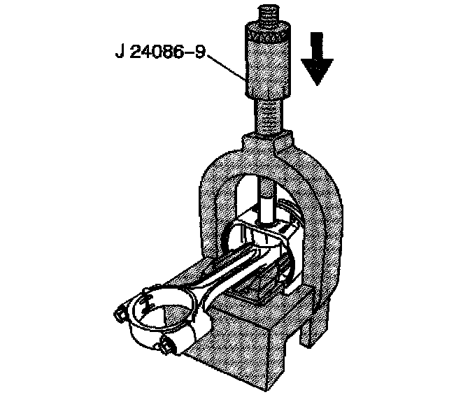 6. Insert pin J 24086-9 through fixture J 24086-10 and to the piston pin.