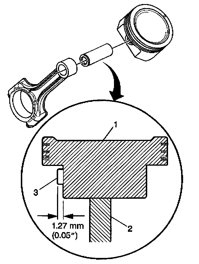 A properly installed piston pin should protrude 1.27 mm (0.05 inch) from the side of the piston.