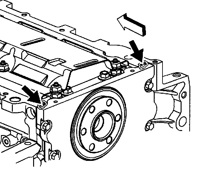 3. Apply a 5 mm (0.2 inch) bead of sealant GM P/N 12378190 or equivalent 20 mm (0.8 inch) long to the engine block. Apply the sealant directly onto the tabs of the rear cover gasket that protrude into the oil pan surface.