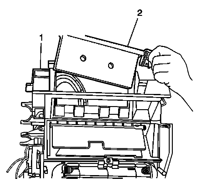 6. Remove the defroster door (2) door from the heater assembly (1).