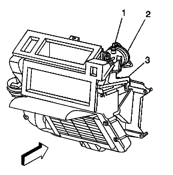 5. Depress the clip and remove the defrost actuator (2) from the heater assembly.