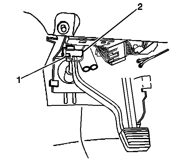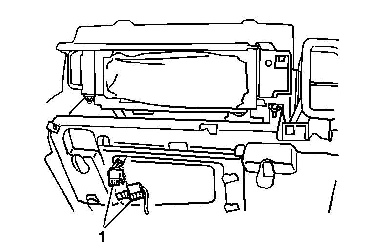 5. Remove the connector position assurance (CPA) (1) from the steering wheel module yellow 4-way connector (2) located left of the steering column near the knee bolster.