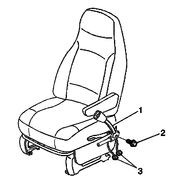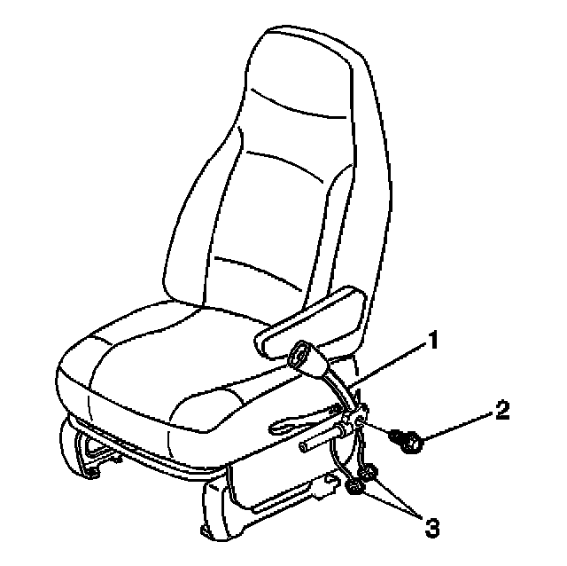 10. Remove the CPA from the RF seat belt pretensioner (1) yellow 2-way connector (3) located under the passenger seat.
