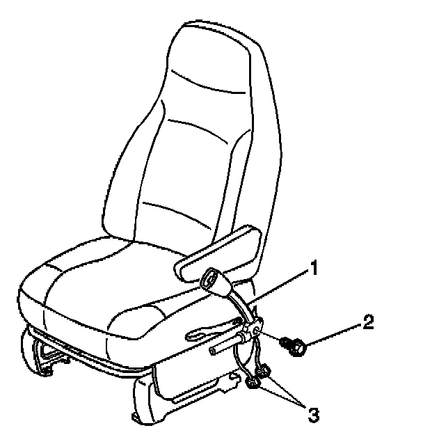 1. Remove the key from the ignition.2. Connect the RF seat belt pretensioner (1) yellow 2-way connector (3) located under the passenger seat.