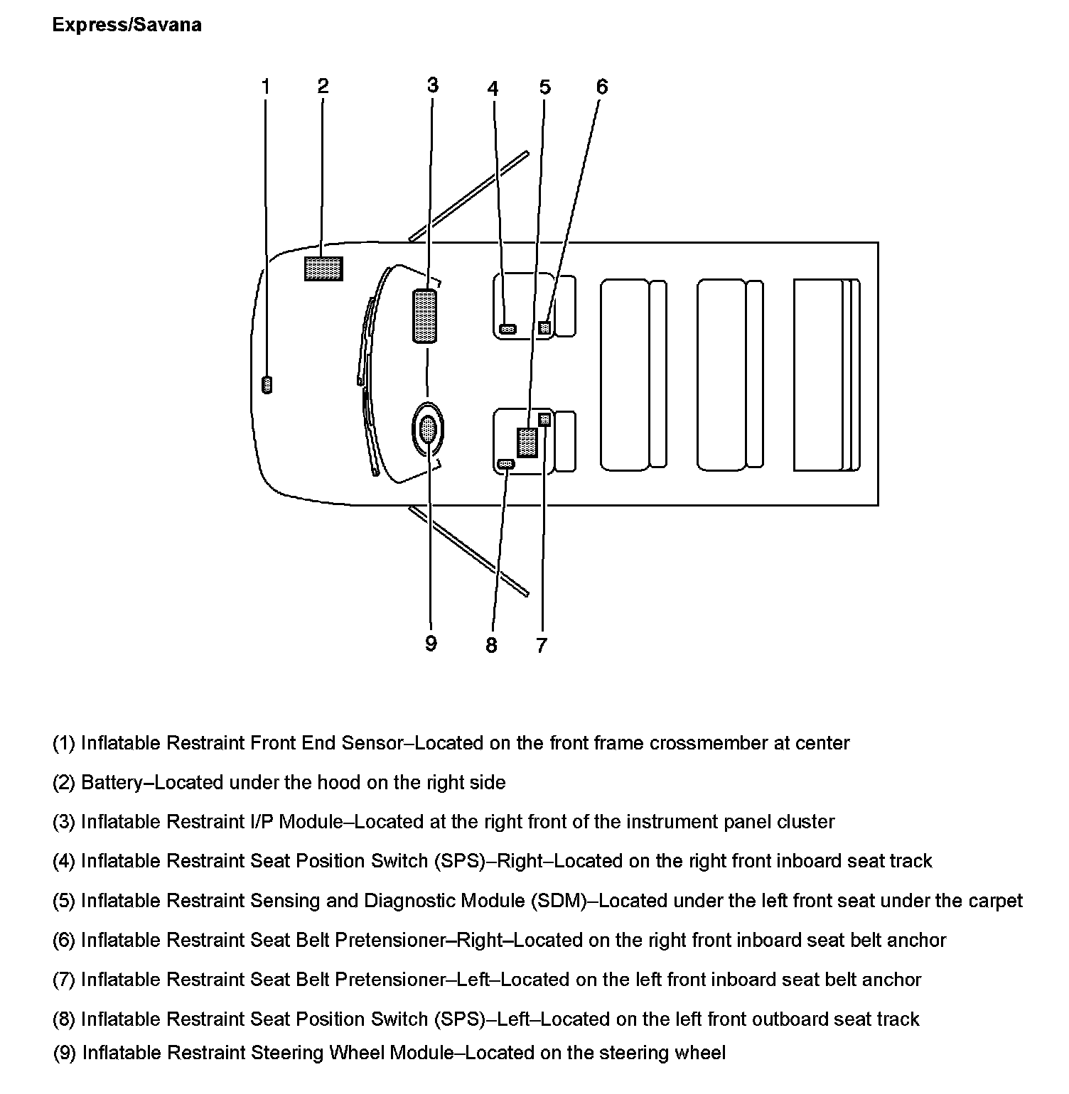 The SIR Zone Identification Views shown below illustrate the approximate location of all SIR components available for the vehicle. This will assist in determining the appropriate SIR Disabling and Enabling Zones for a given service procedure, refer to SIR Disabling and Enabling Zones.
