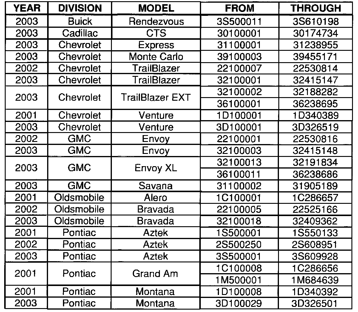 Involved are certain 2003 model year Buick Rendezvous; 2003 model year Cadillac CTS; 2001 model year Chevrolet Venture; 2002 model year Chevrolet TrailBlazer; 2003 model year Chevrolet Express, Monte Carlo, TrailBlazer, TrailBlazer EXT, Venture; 2002 model year GMC Envoy; 2003 model year GMC Envoy, Envoy XL, Savana; 2001 model year Oldsmobile Alero; 2002 model year Oldsmobile Bravada; 2003 model year Oldsmobile Bravada; 2001 model year Pontiac Aztek, Grand Am, Montana; 2002 model year Pontiac Aztek; 2003 model year Pontiac Aztek, Montana vehicles built within the VIN breakpoints shown.