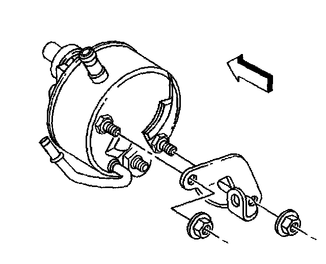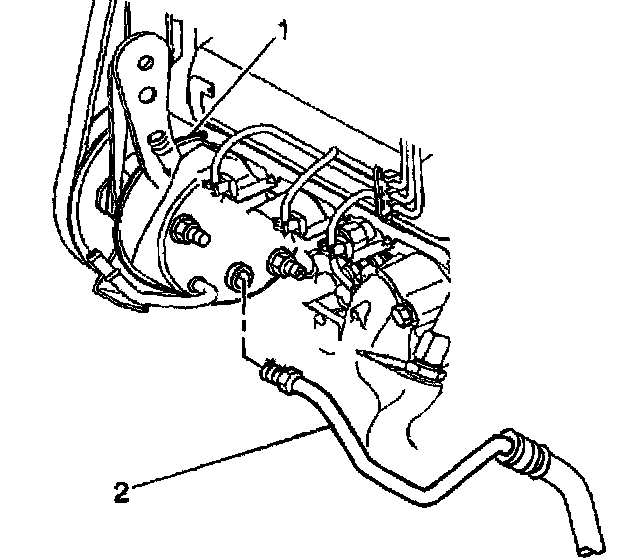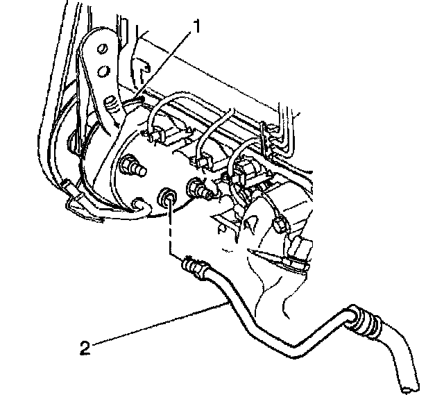 9. Disconnect the power brake booster inlet hose (2) from the power steering pump through the wheel well.