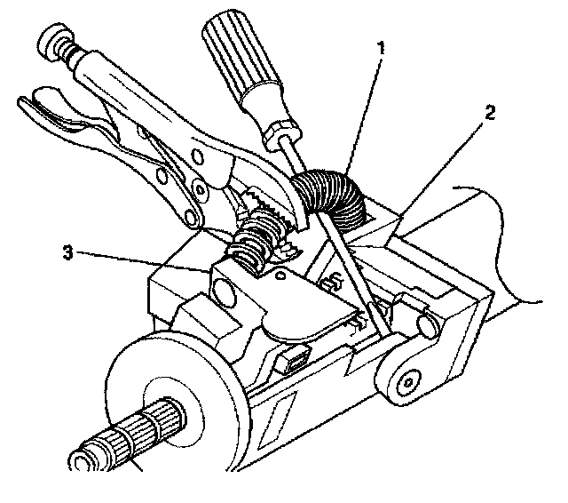 5. Remove the tilt spring (1) from the steering column support assembly (2) and from the steering column tilt head assembly (3) by using the following procedure:
