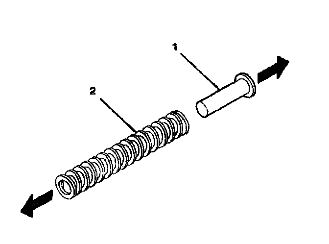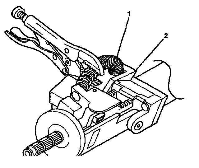 3. Install the tilt spring (1) onto the steering column support assembly (2) and onto the steering column tilt head assembly by using the following procedure: