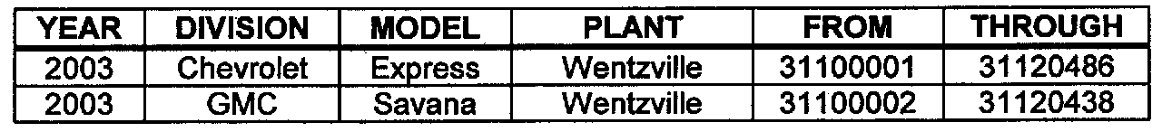 Involved are certain 2003 model year Chevrolet Express and GMC Savana vehicles built within these VIN breakpoints shown.