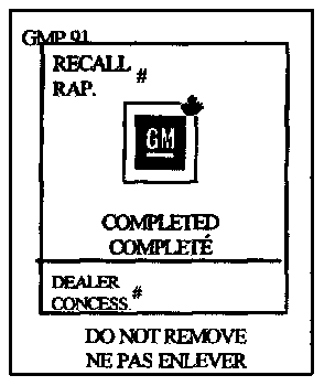 Put the Recall Identification Label on a clean and dry surface of the radiator core support in an area that will be visible to people servicing the vehicle. Additional Recall Identification Labels for Canadian dealers can be obtained from DGN by calling 1-800-668-5539 (Monday- Friday, 8:00 a.m. to 5:00 p.m. EST). Ask for Item Number GMP 91 when ordering.