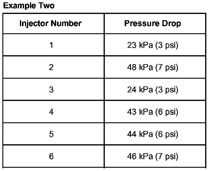 6. Subtract the lowest pressure drop, leanest injector, from the highest pressure drop, richest injector. If there is more than a 20 kPa (3 psi) difference between the lowest and highest pressure drop, then the fuel injectors may be the cause of the driveability symptom. See the example tables below to determine if cleaning is appropriate.