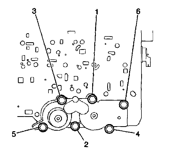 8. Install the six accumulator housing bolts (6). Start the bolts finger tight and work towards the opposite end.