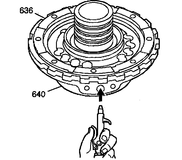 8. Remove the intermediate clutch piston (636). Apply shop air to the center support bolt hole to aid in piston removal.