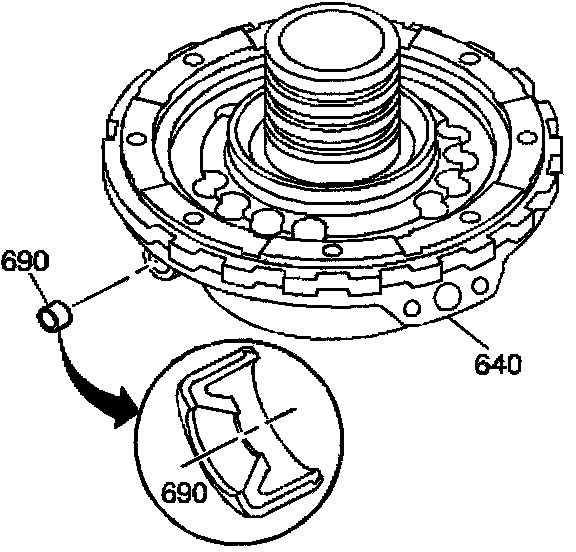 6. Install the intermediate clutch piston spring assembly (635). Align the springs with the pockets in the intermediate clutch piston.