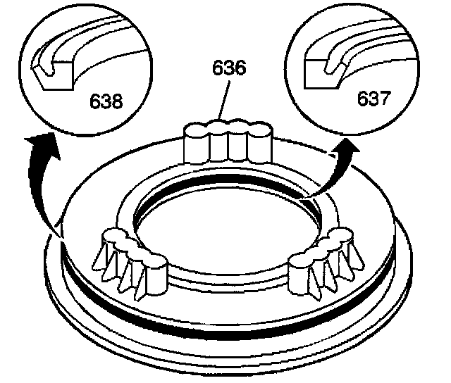 3. Install the inner (637) and outer (638) intermediate clutch piston seals onto the intermediate clutch piston (636) with the seal lip facing away from the spring pockets.
