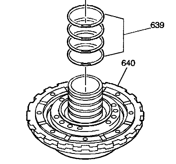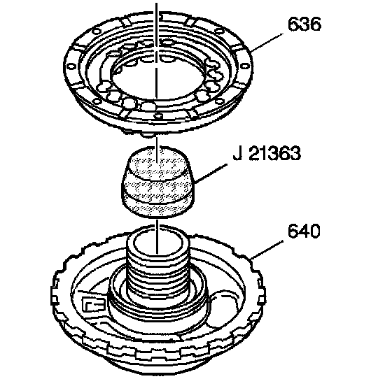 4. Install the intermediate clutch piston (636) onto the center support (640) using the J 2136a. A fine gauge feeler blade can be used to assist with the piston outer seal installation.