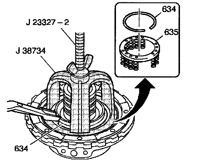 7. Install the intermediate clutch piston spring retainer ring (634) using the J 38734 and the J 23327.
