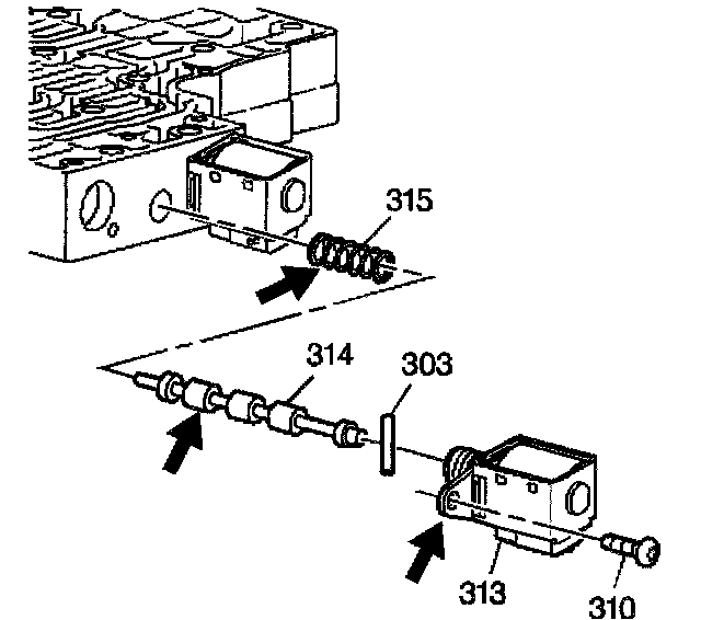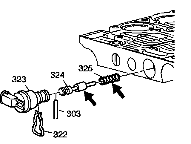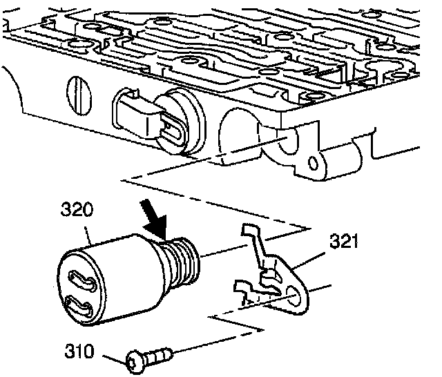 1. Remove the pressure control solenoid clamp bolt (310) and clamp (321).