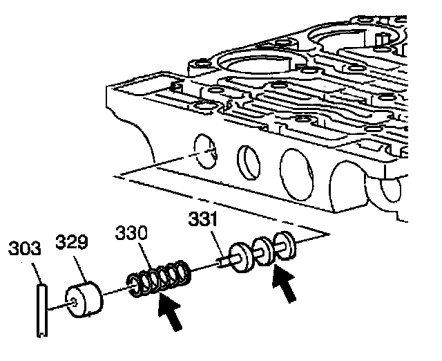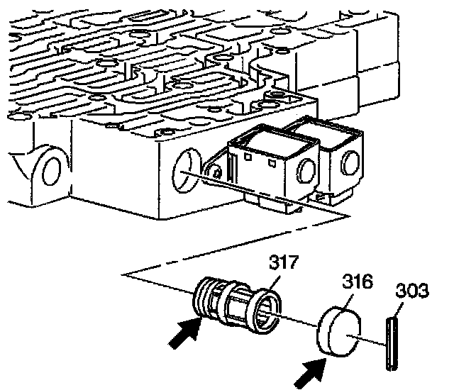 28. Remove the shift valve fluid filter bore plug pin (303).