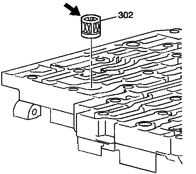 23. Inspect the pressure control solenoid valve fluid filter (302) for damage.
