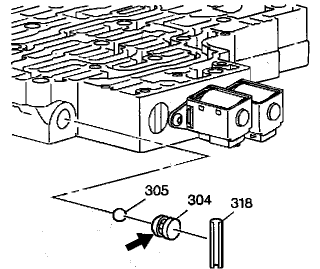 6. Remove the TCC regulator apply valve pin (303). Use a drill bit to remove the spring pin.