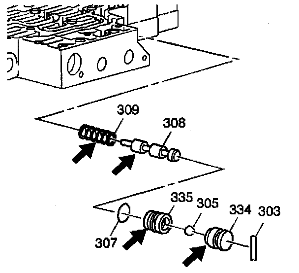 53. Inspect the 3rd-reverse ball valve bushings (305, 335), the 3rd-reverse ball valve (305) and the 3-4 shift valve (308) for porosity, scoring, and nicks.