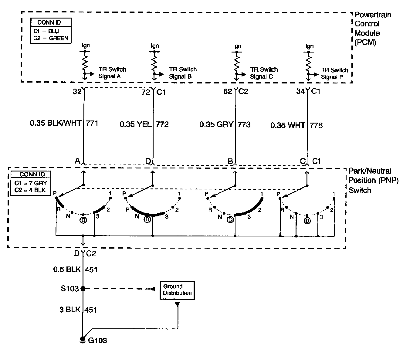 The transmission range (TR) switch is part of the park/neutral position (PNP) and back-up lamp switch assembly, which is externally mounted on the transmission manual shaft. The TR switch contains four internal switches that indicate the transmission gear range selector lever position. The PCM supplies ignition voltage to each switch circuit. As the gear range selector lever is moved, the state of each switch may change, causing the circuit to open or close. An open circuit or switch indicates a high voltage signal. A closed circuit or switch indicates a low voltage signal. The PCM detects the selected gear range by deciphering the combination of the voltage signals. The PCM compares the actual voltage combination of the switch signals to a TR switch combination chart stored in memory.