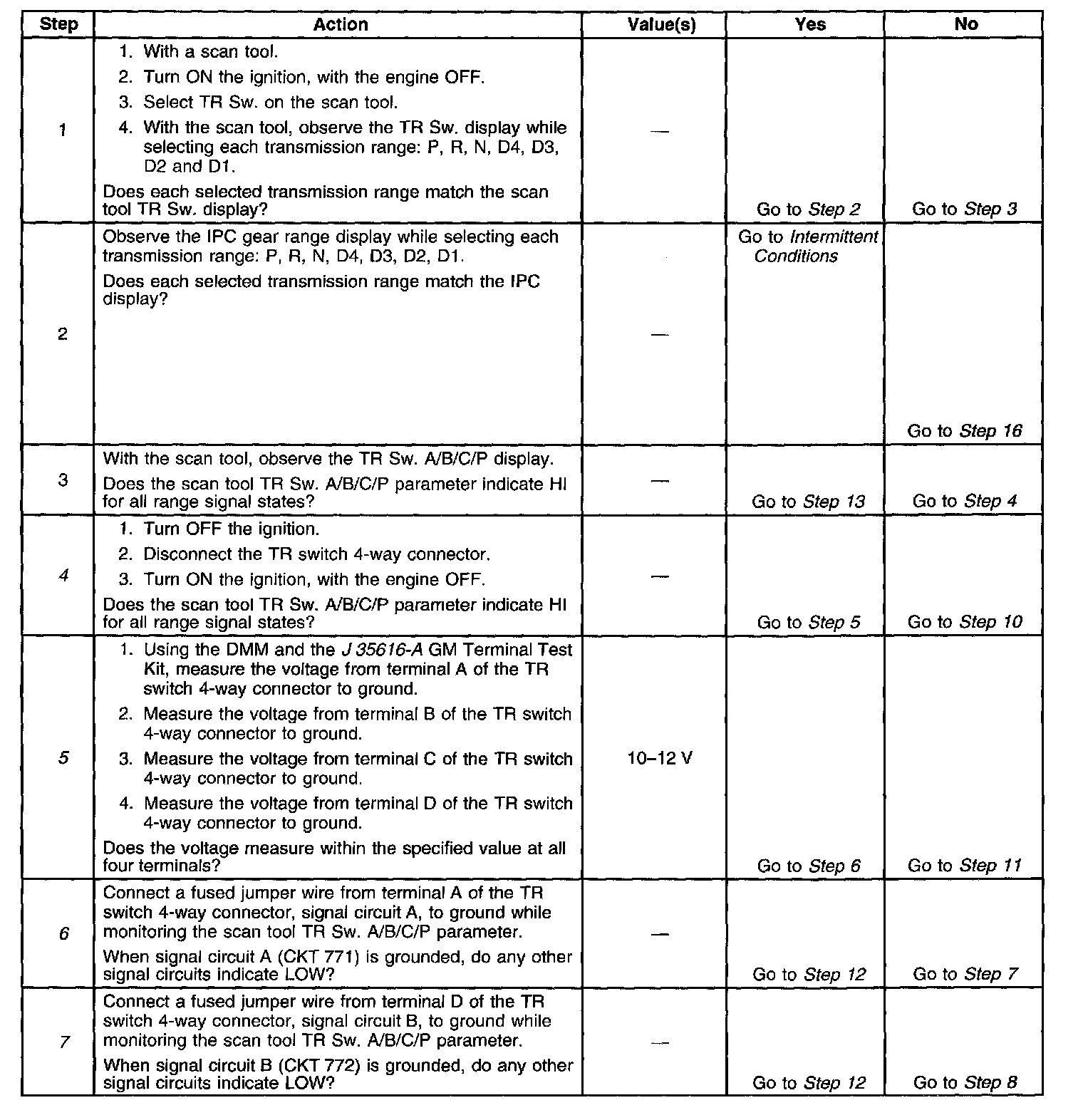 5. This step tests the TR switch wiring for an open or the lack of the signal voltage from the PCM.