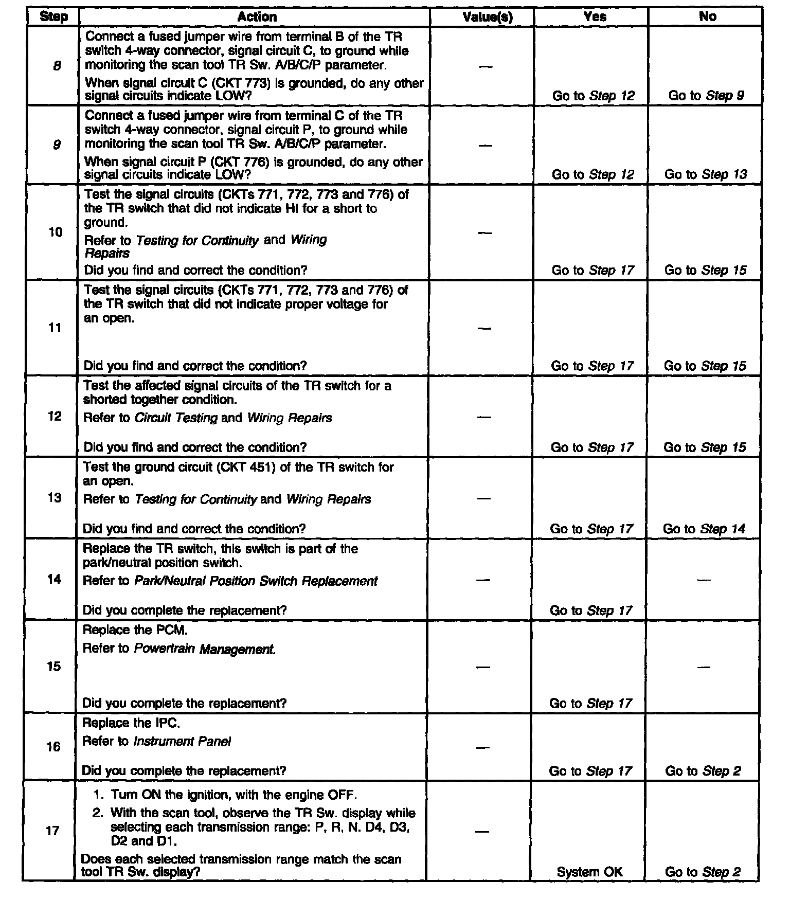 8. This step tests the TR switch wiring and the PCM by providing a ground path through a fused jumper wire. When grounded, the scan tool range signal states should change to LOW.
