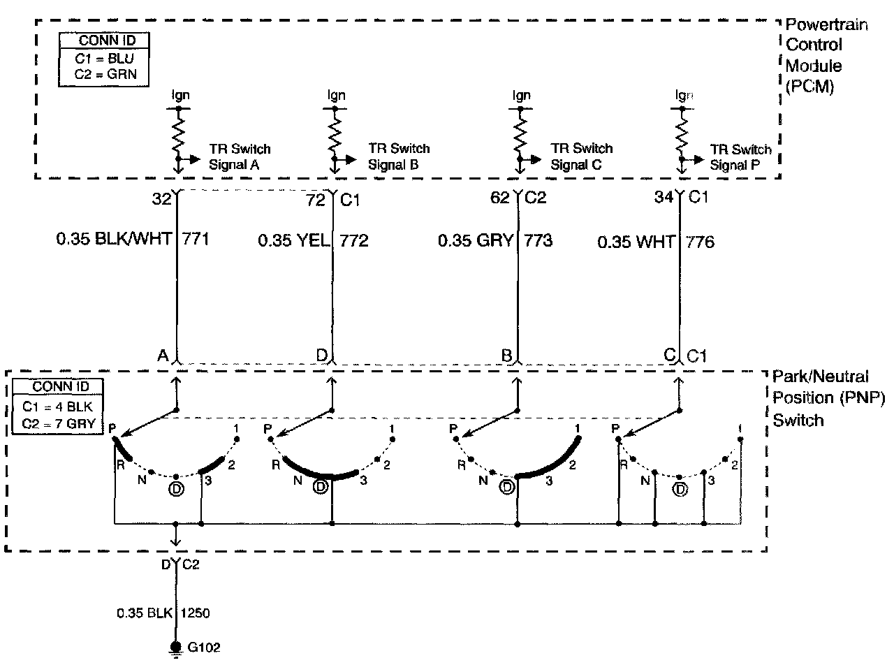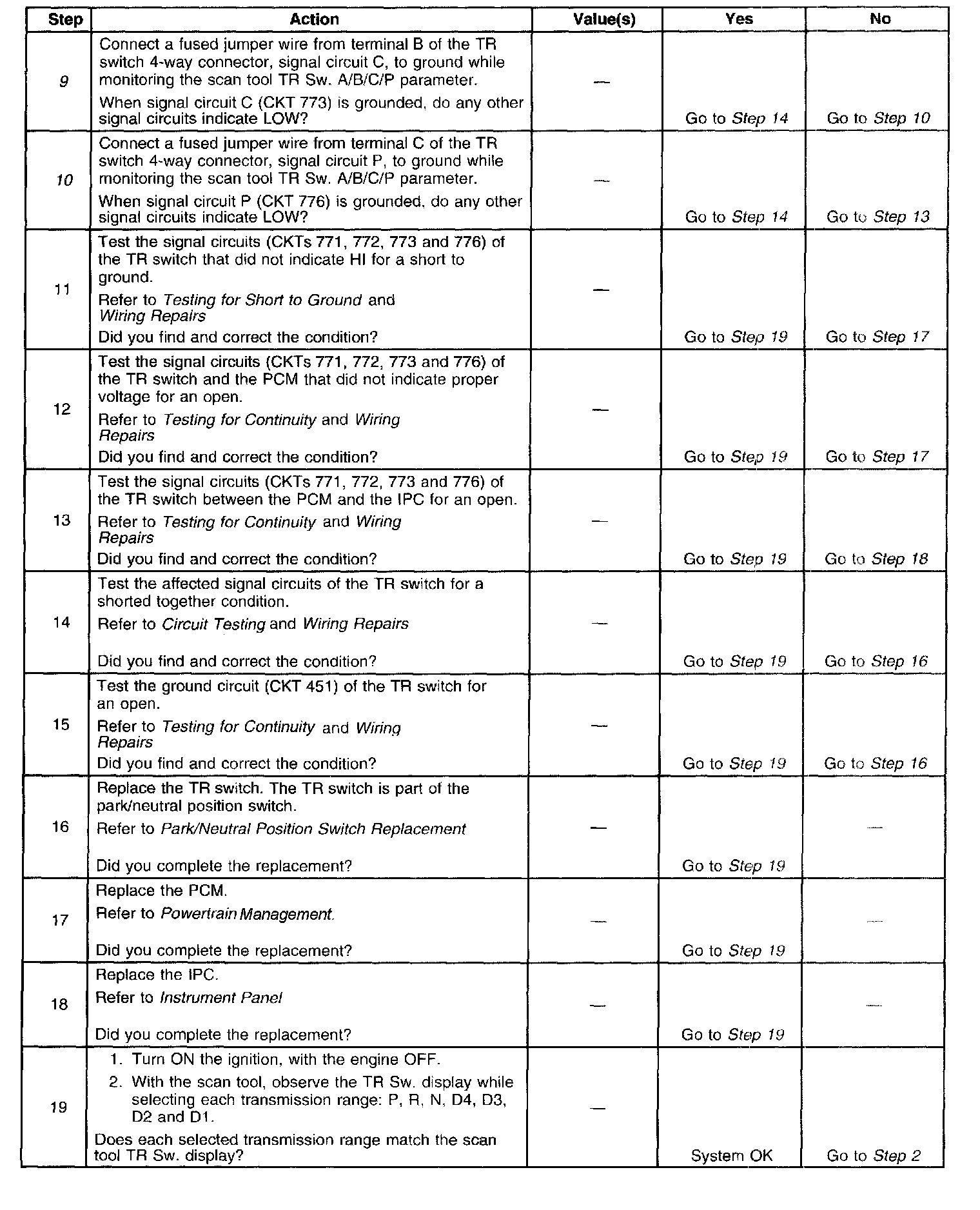 Refer to Transmission Range Switch Logic for valid combinations of switch signal circuits A, B. C and Parity. On the table, HI indicates an ignition voltage signal. LOW indicates a zero voltage signal.