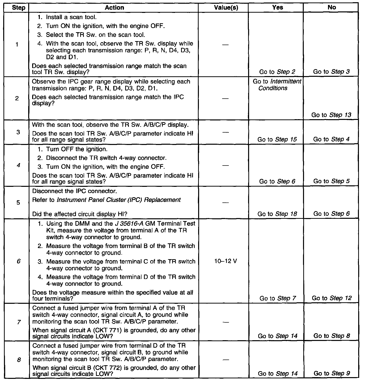 6. This step tests the TR switch wiring for an open or the lack of the signal voltage from the PCM